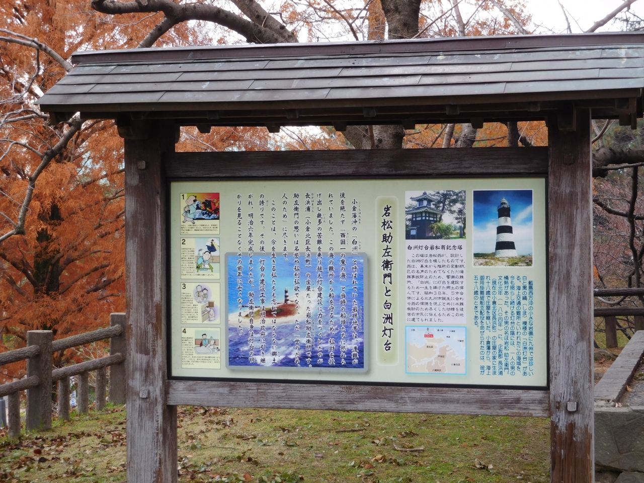 勝山公園内、松本清張記念館のすぐ左側の少し奥まった場所にありました。また、すぐ横には、船の遭難が絶えない小倉藩沖の海の難所から船を守る為に、私財を投げ打って灯台建設に尽力をつくした岩松助佐衛門の解説が分かりやすく書かれていました。遠くから見た時は、一瞬、小倉城のミニチュア版かと思ってしまいましたが、こんな歴史があったのか、と勉強になりました。