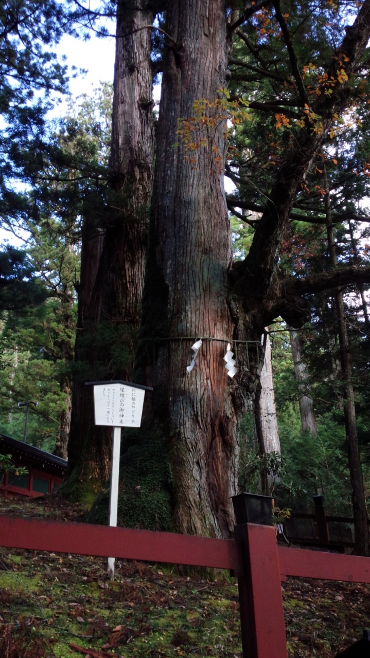 普通の立派な御神木のほかに、縁結びの神社らしい夫婦杉、親子杉など幾つかの御神木があるようですが、一番印象に残ったのは参道の階段の脇にあった、縁結びの御神木でだじゃれのようなちょっとお茶目な感じのの杉と楢の木がくっついたたすきなら一緒にという御神木です。