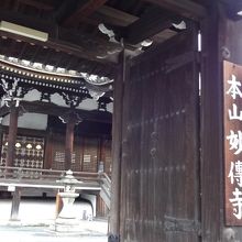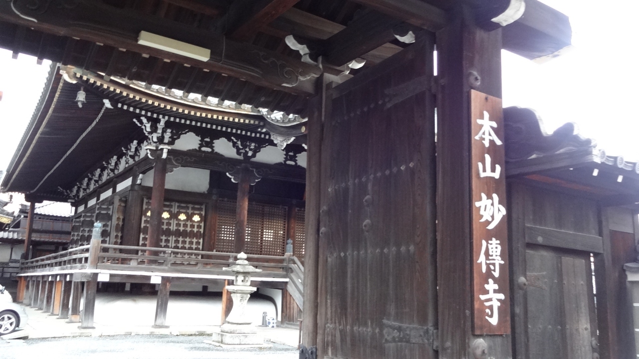 東山二条交差点の角に建っています。この界隈には多数のお寺さんがありますが、大きな本堂と経典を持った日蓮上人の像が一際目を引きます。日蓮宗の本山の一つで、 鎌倉の本覚寺が「東身延」に対し、「西の身延」なんだそうです。本山の山梨県の身延から日蓮聖人の分骨が奉られているとのこと。山門のところに「日蓮上人御分骨之道場」の石標が立っています。他のお寺と同様、境内は駐車場になっており、あまり雰囲気はよいとはいえませんでした。つい最近、こちらのご本尊の青銅の半跏思惟像が千年も前に、朝鮮半島で製作された可能性が高いという報道があり驚きました!