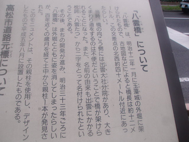 アーケードの発達した高松市内の中では、相対的に目立たない印象のある兵庫町商店街ですが、片原町や丸亀町のアーケードと直結していますので、続きで歩かれるのに良い所です。ここは中央通りを境に東西に分断されていますが、その間には、高松市の道路元標やかつては玉藻城の外堀に架けられていたという八雲橋の旧来の親柱を用いた再現モニュメントなどもあって、アーケード歩きの途中で是非観ておきたいスポットだと思います。尚、ここは意外とおうどん屋さんが多いので、リピーターの方は特に各お店の食べ比べを楽しんでみられるのも良いと思います。