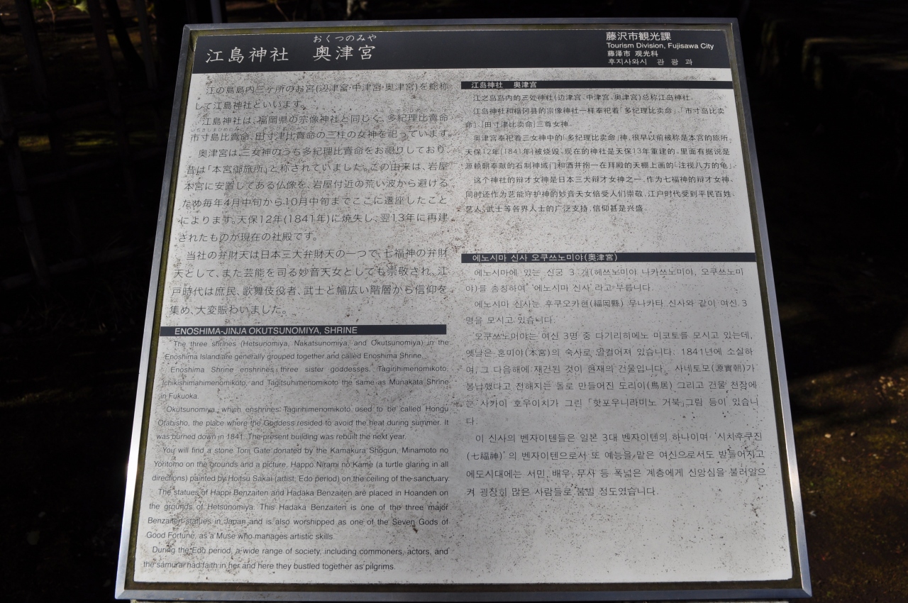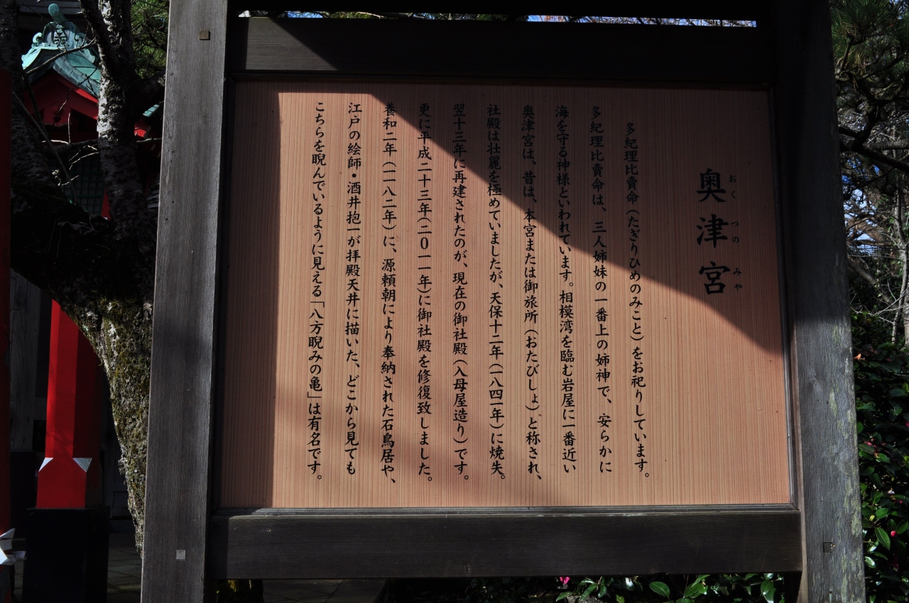 江の島神社には、辺津宮、中津宮、奥津宮の3つの大きな宮があり、それぞれに女神が祀られています。その中で、江の島の最も奥にある奥津宮には多紀理比賣命(たきりびめのみこと)という女神さまが祀られているとのことです。奥津宮は江の島の入口から最も遠く、普通に見学しながら歩いてくると1時間程度はゆうにかかってしまいます。そのため、奥津宮付近まで参拝に来る人はかなり少ないです。そのため、ゆっくりと参拝することができました。3つの宮の中では一番落ち着いて参拝することができて良かったです。奥津宮の前の石鳥居は源頼朝公によって奉納されたものとのことで驚きました。近くには龍宮、亀石、力石などの史跡がいくつかあるので、一緒に回ると良いかと思います。