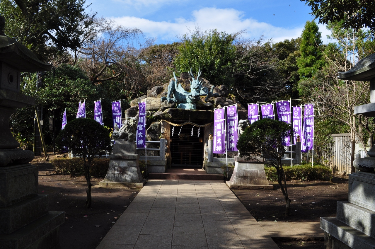 江の島の奥の方、江島神社奥津宮のすぐ隣にありました。案内板によりますと、江の島は誕生以来龍神が住まわれる場所として信仰され、「太平記」でも北条時政が参拝(案内板には参龍と書かれていましたが)したとの記録が残っているそうです。石でできた祠の中に神社があり(なぜかシャッターで守られている)、祠の上には龍の像があるのですが、近づいてみるとイマイチ迫力に欠けるといいますか、愛嬌があるお顔立ちで笑ってしまいました。江の島の守り神としての龍神様、江の島の奥まで足を運ぶと、そういった江の島の歴史・文化・神事が学べて面白かったです。