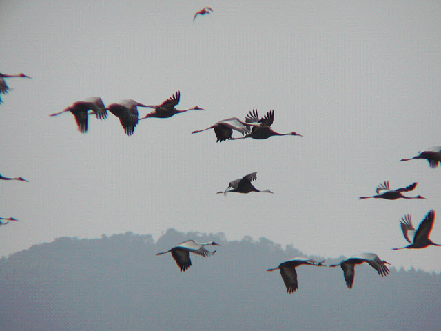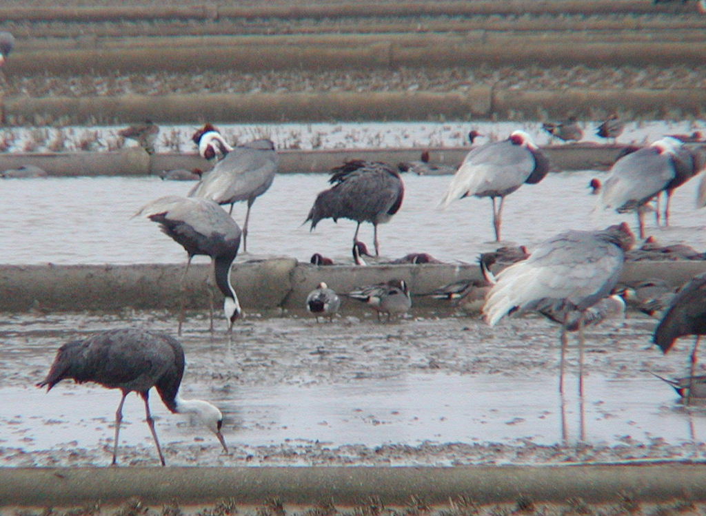 出水市は鶴の越冬地として有名なところで、 毎年1万羽を超える鶴がシベリア方面やロシア東南部、中国東北部より越冬のため出水市へ渡来しているそうです。渡来するツルの種類は、ナベヅル(約9000羽)とマナヅル(約3000羽)が主で、他にはクロヅルやカナダヅル、ナベクロヅルなどが数羽程度渡来するそうです。ヒマラヤ越えで有名なアネハヅルも渡来する事もあるそうですが、私達が訪れた時は見られませんでした。ツル観察センターの観察指導員?の方が、観光客にいろいろと説明していました。