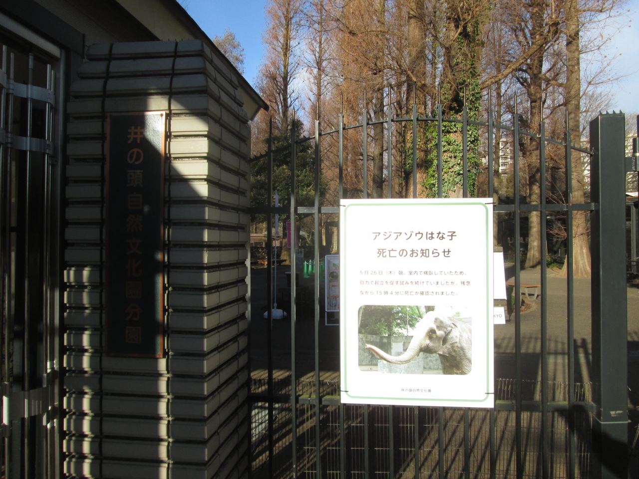 2016年は、5/26にアジアゾウの「はなこ」が死んだという悲しいニュースがありました。年が明けても、エントランスにはニュースの張り紙がありました。半年以上が経ちましたが、はなこが園内のマスコット的な動物であったことが分かります。