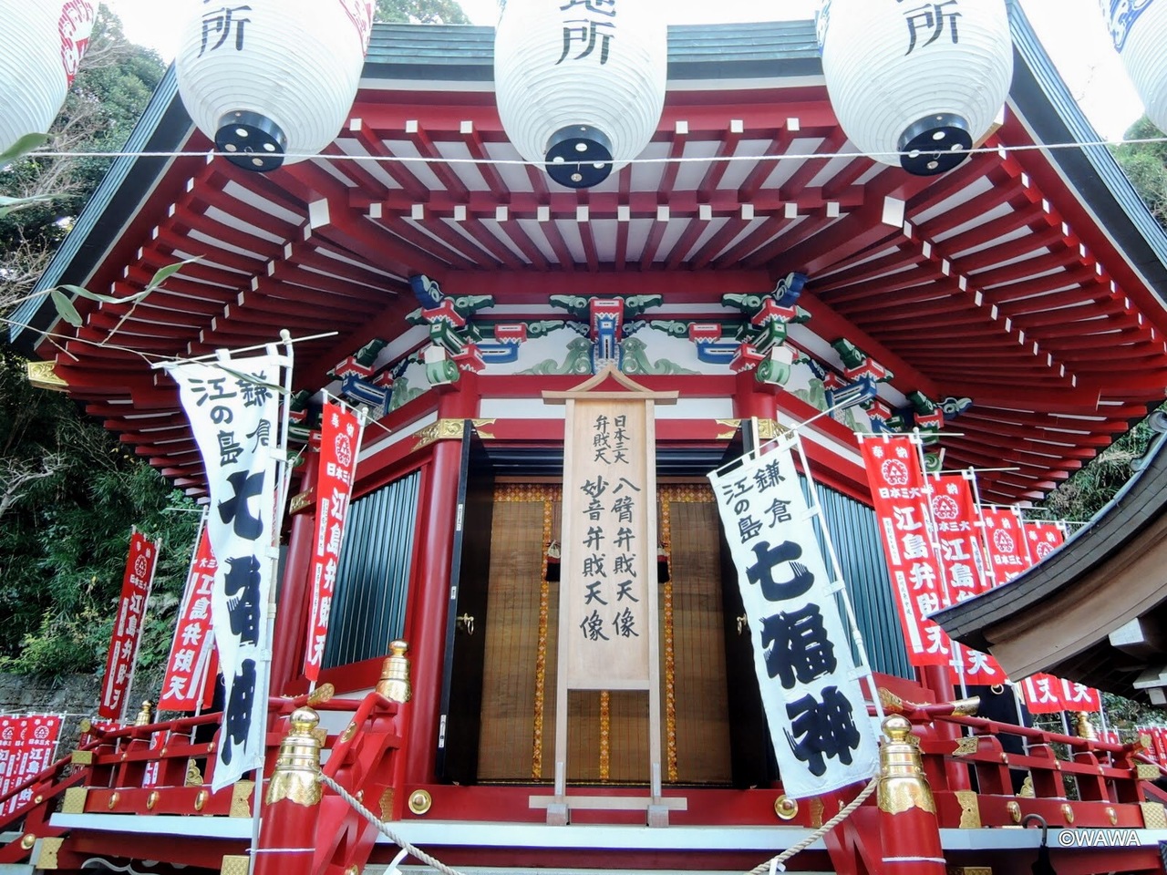 江島神社 泰安殿は、辺津宮(へつみや)境内にある真赤な六角形の社殿です。江戸時代まで江島神社全体でお祭りしていた弁財天が明治の神仏分離令により宗像三女神に変わったことから、ここに八臂弁財天と妙音弁財天が安置されていると解説にありました。