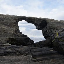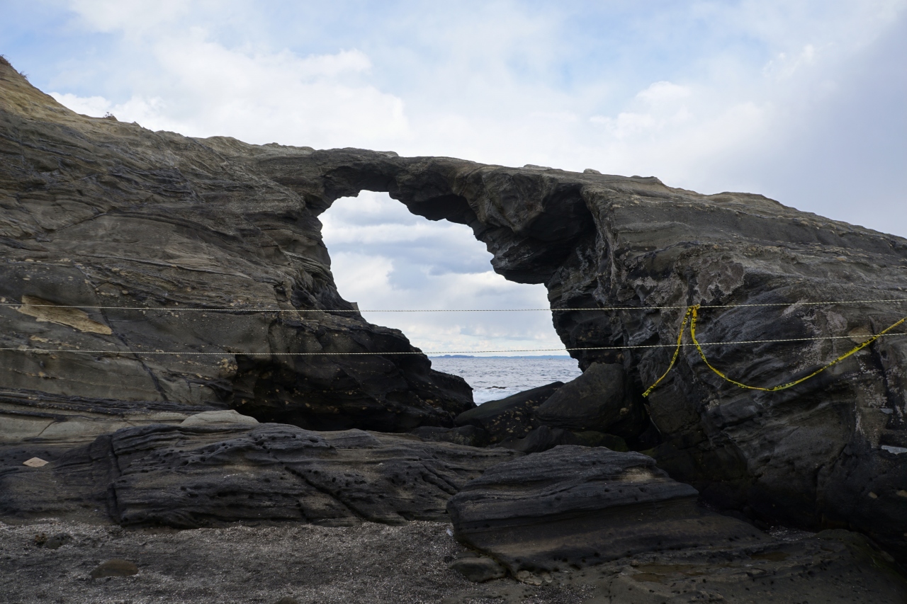 馬の背洞門は、城ケ島に来たならぜひ訪れたいスポットでしょう。岩場の海岸の先端にぽっかりと空いた空洞は自然の洞穴にしてはちょっと格好良すぎですよね。最近は岩がもろくなったということで上に登ったりはできなくなったよう。以前はこれに登ったりしてたんですが、ちょっと残念かなと思います。