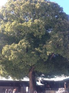 明治神宮の本殿の前、左右に大きくそびえる夫婦楠がお参りをする前に心を落ち着けてくれます。