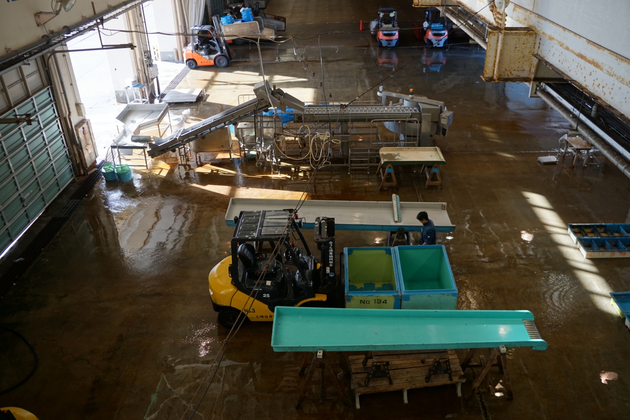 三崎魚市場は、バス停三崎港から。うらりを抜けていった先です。二階が入口で、そこから見学コースがあって、市場を上から眺めます。ただ、セリが終わった後の市場はがらんとしていて、それを見てもどうと言うことはないような。市場の食堂があって、あとはそっちで朝飯を食うくらいかなと思います。