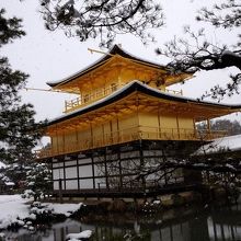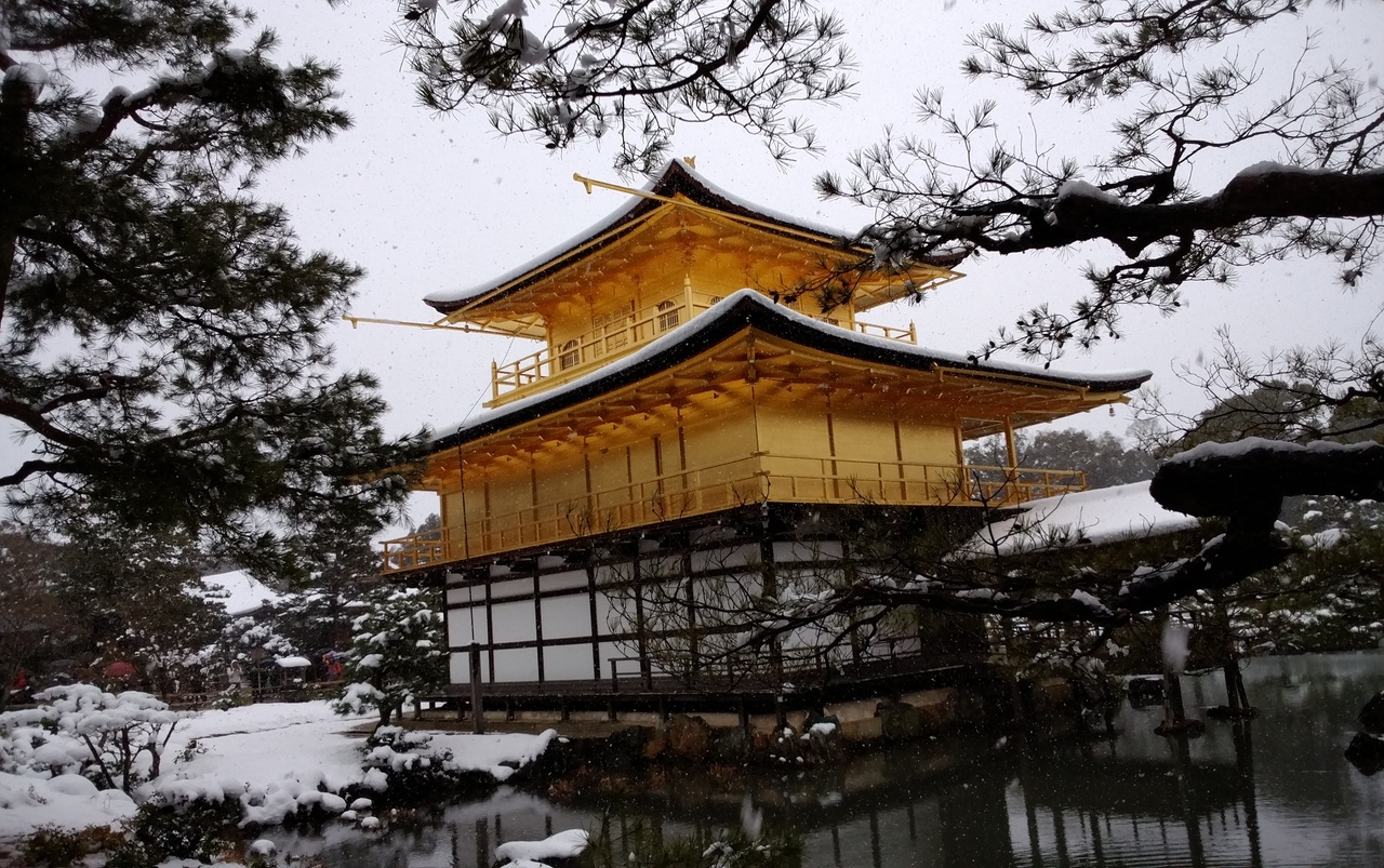 雪が降ると、明日は雪の金閣寺が見られると思うほど、冬の京都の名物?です。本当は前日に降った雪をかぶった晴れの日の金閣寺が写真映えするのですが、あいにく行った日は途中で吹雪いてきて寒くて大変でした。それでも沢山の人が来ていて、その美しさに息を飲んでいました。白い世界に金色が映える景色が、何か幻想的で、心に残る美しさです。