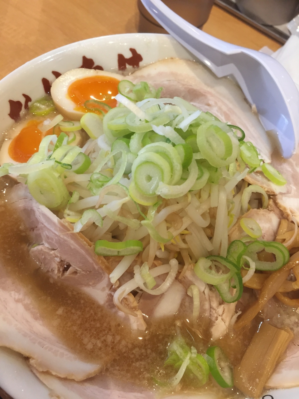 背脂の甘みがスープとマッチし、ねぎやもやしの野菜類、トッピングのチャーシューと味玉と全体的に好印象なラーメンでしたが、少し麺が柔らかい気がしました。