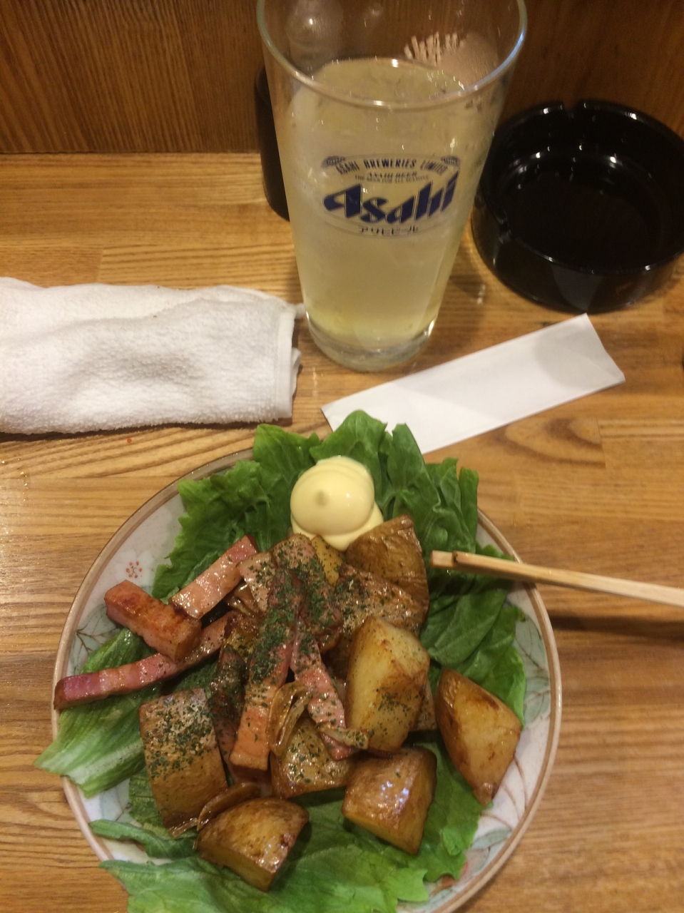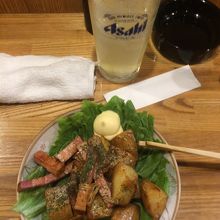 カウンターには8人ぐらい座れ、その他テーブル席3つあります。壁には手製のメニューが貼ってあります。まずは、もつ煮込み豆腐を注文…量が結構あり豆腐が真ん中に入っていて家庭的な味、続いてじゃがベーコン、此方も量が多くベーコン厚めでした。鳥唐揚げはハーフサイズにしましたがこちらも4つ出てきて既にお腹一杯です。どれも量が多く家庭的な味でした。客は一人で来ている人が多く常連客でした。