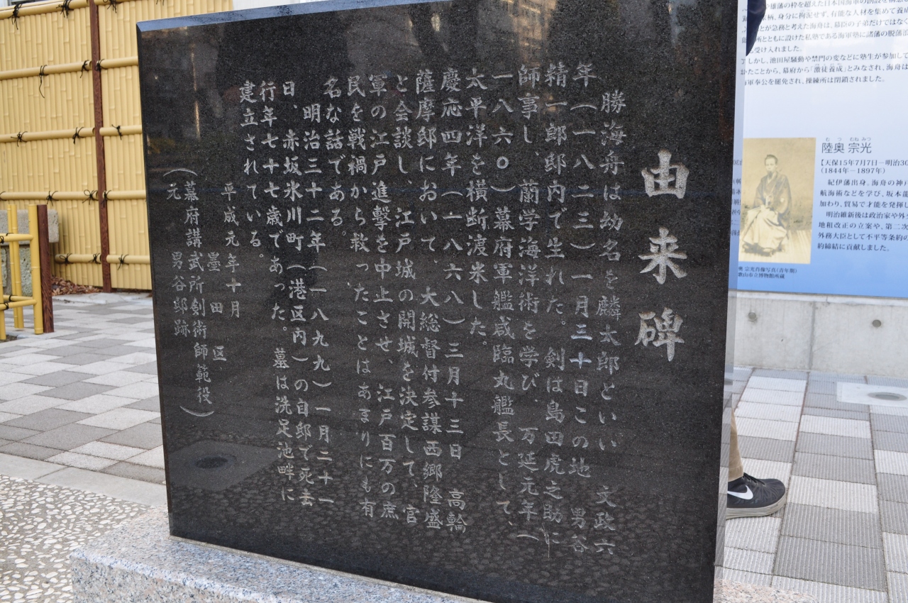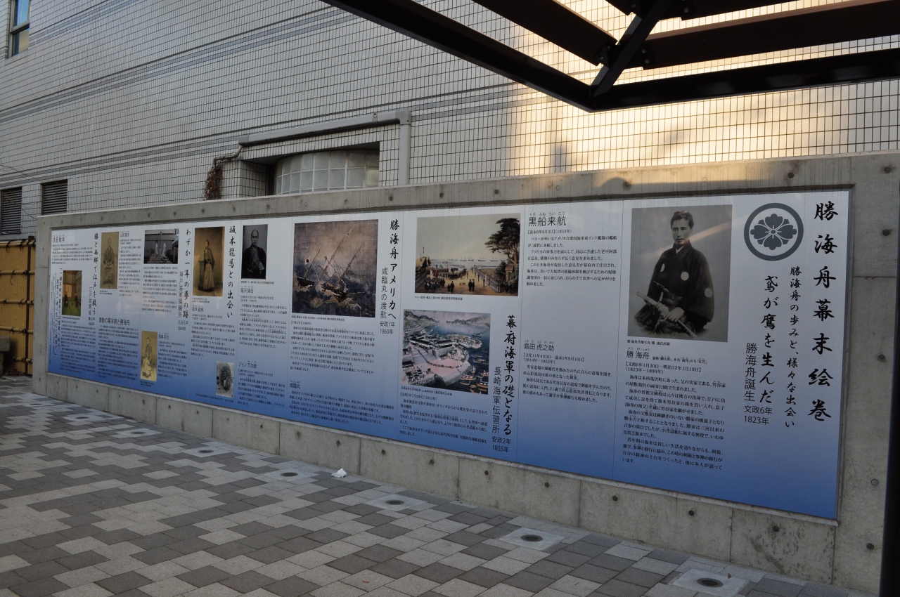 JR両国駅東口から徒歩10分ほどの場所にある両国公園の一角に勝海舟生誕の地の史跡があります。石碑だけでなく勝海舟幕末絵巻という絵巻状の大型のパネルも用意されており、大きな写真付きでとても分かりやすい資料でした。公園の一角にある史跡としてはとても充実した素晴らしい史跡だと思います。