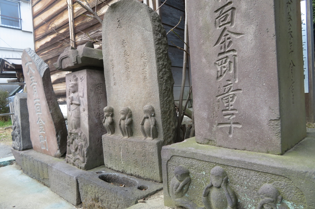 こぢんまりとした境内ながらも、社務所もあり、境内はきれいに整備されるなど、非常に好感が持てます。肝心の庚申塔群は手水舎横手にありました。