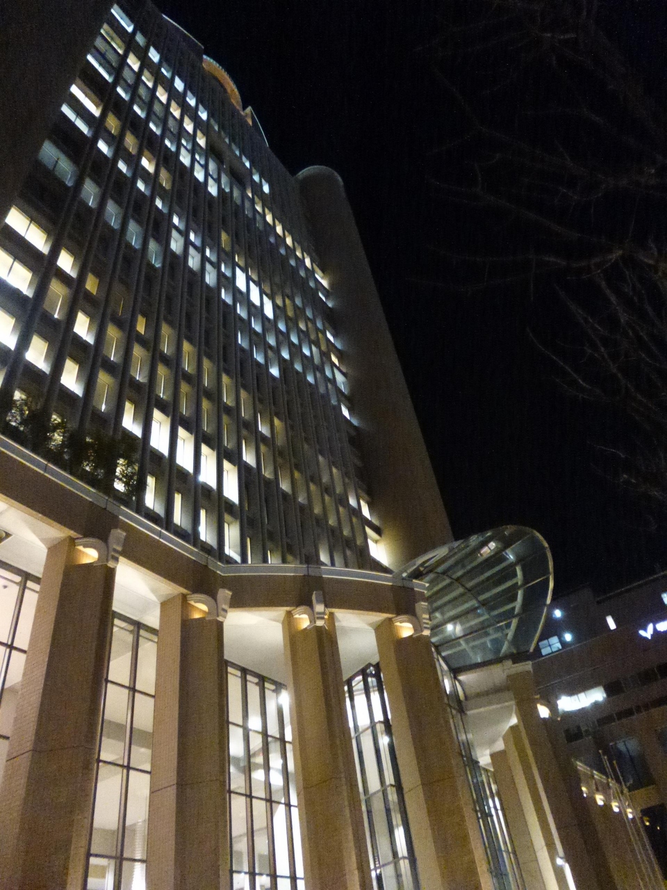 陽が落ちてから、明治大学の前を歩きました。建物の中からの灯りで、昼間とはまた違った、雰囲気のある建物でした。以前(大分前ですが)の明治大学は、前を通ると、大学という雑然とした雰囲気のある建物でしたので、いつも通るたびに、変わったなと思います。