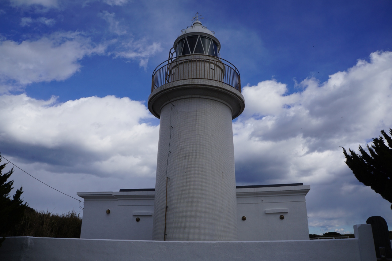 城ケ島行きのバスの終点から城ケ島の散策を始めると、この城ヶ島灯台が最初の目標地点となります。終点からは歩いて10分かかるか、かからないかくらい。市街の途中から灯台に向かう階段があって、それを登ればわけなく到着します。近くで見るとずんぐりした形。低いですが塀にも囲まれていて、意外に風情はイマイチかなと思いました。