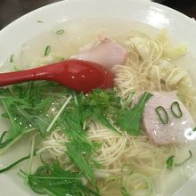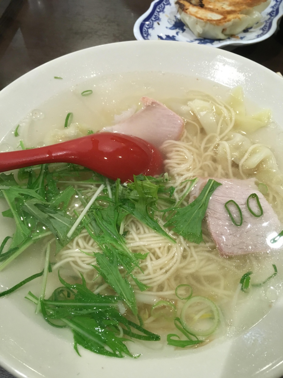 透き通ったスープに細麺、水菜がトッピングされていてとってもあっさり。