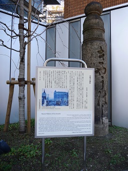 京橋は京橋川に架かる名橋でしたが、昭和に入り高速道路が建設された際に撤去されましたが明治と大正時代に架け替えられた時の親柱が保存されていました。交番の脇に有る親柱が明治時代の物で、趣のある字体で刻まれています。