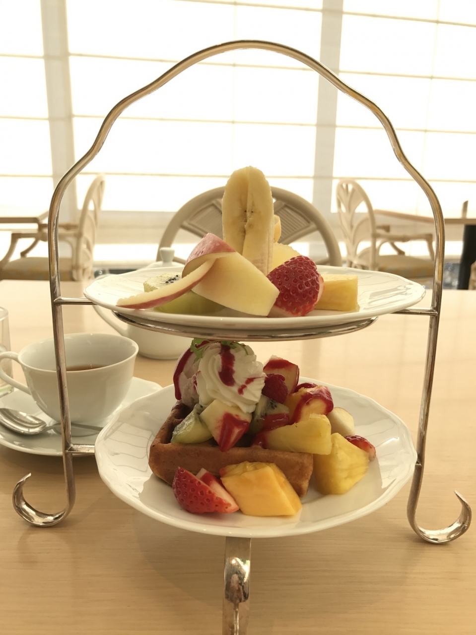 ワッフルにもたっぷりフルーツが盛られており、紅茶はポットサービスで3杯分くらいありました。