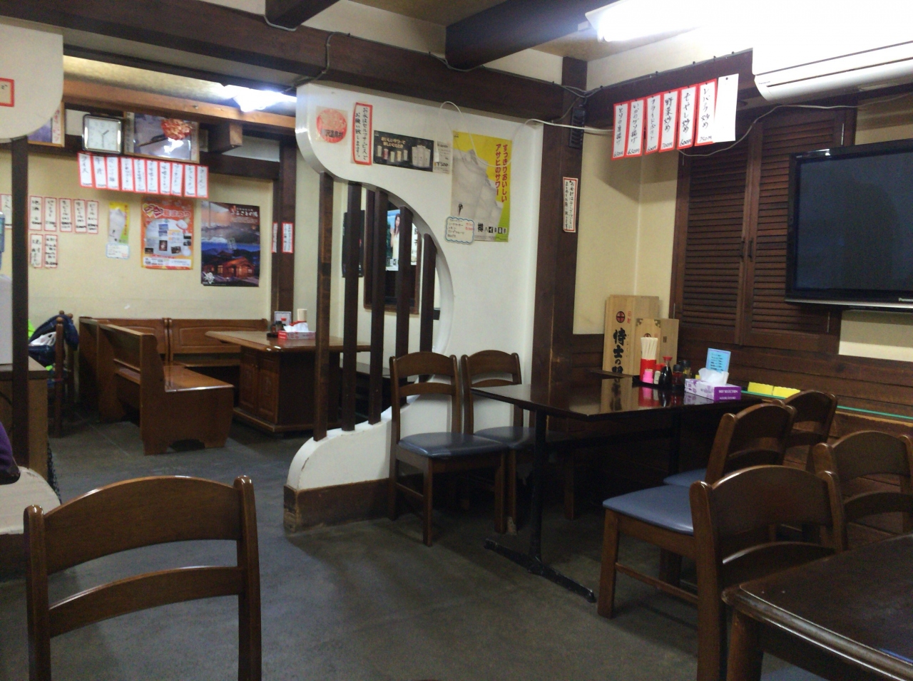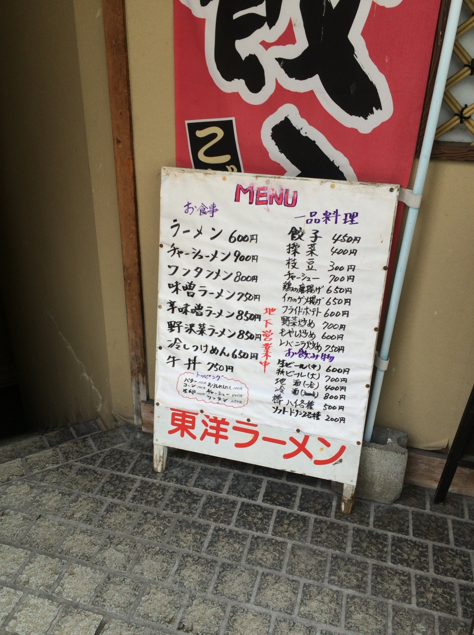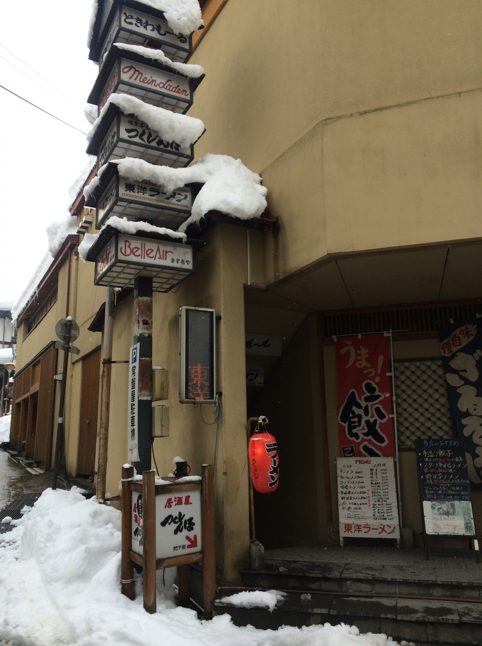 野沢温泉のシンボル外湯の大湯横常盤屋旅館の暗い地下にある東洋ラーメン野沢菜担々麺850円、ちょっと癖なるような辛さがいい野沢菜と赤唐辛子と鶏肉炒めてあんかけにした感じ野沢温泉はそれにして欧米人が多い3組皆欧米人だった