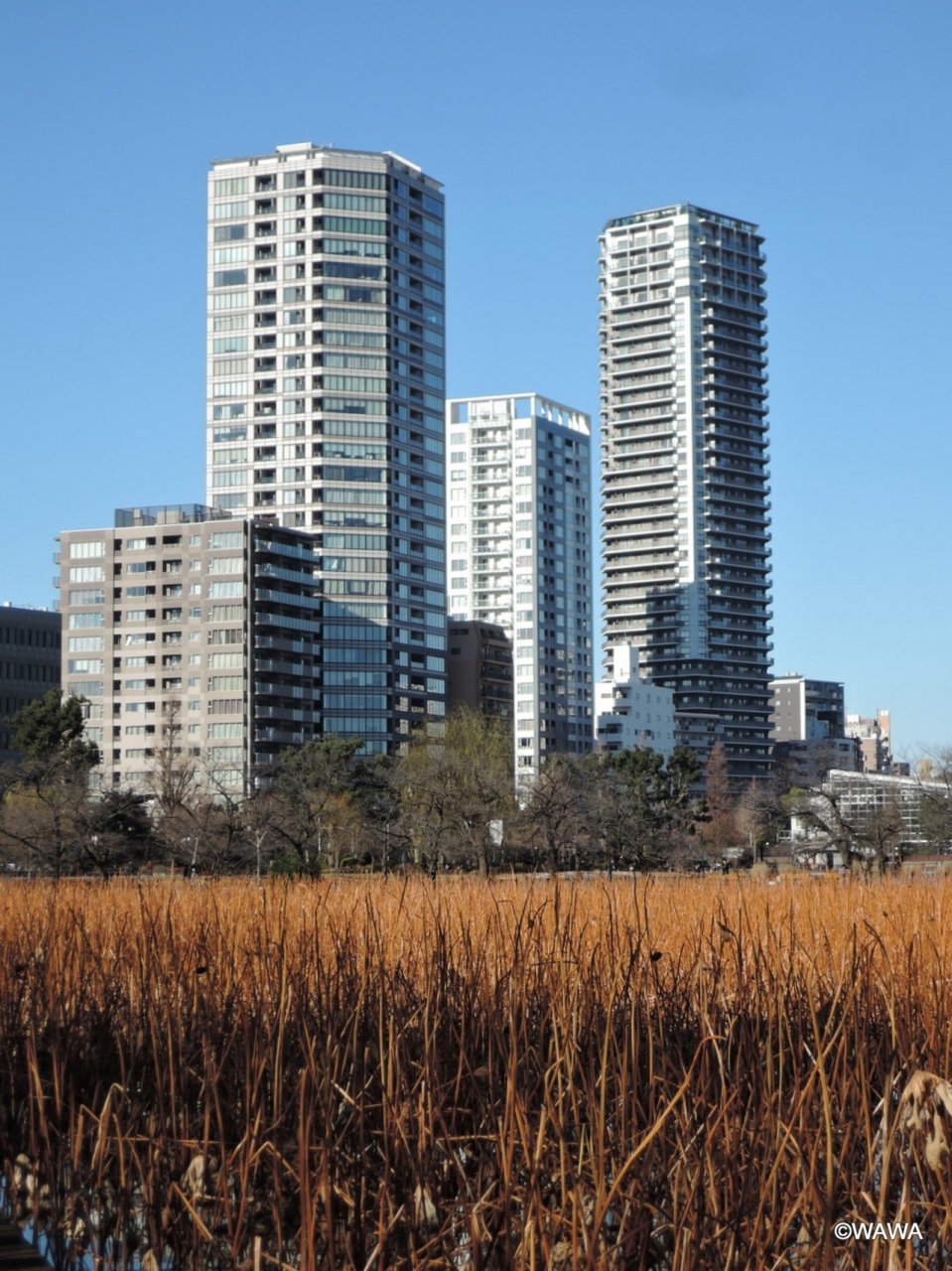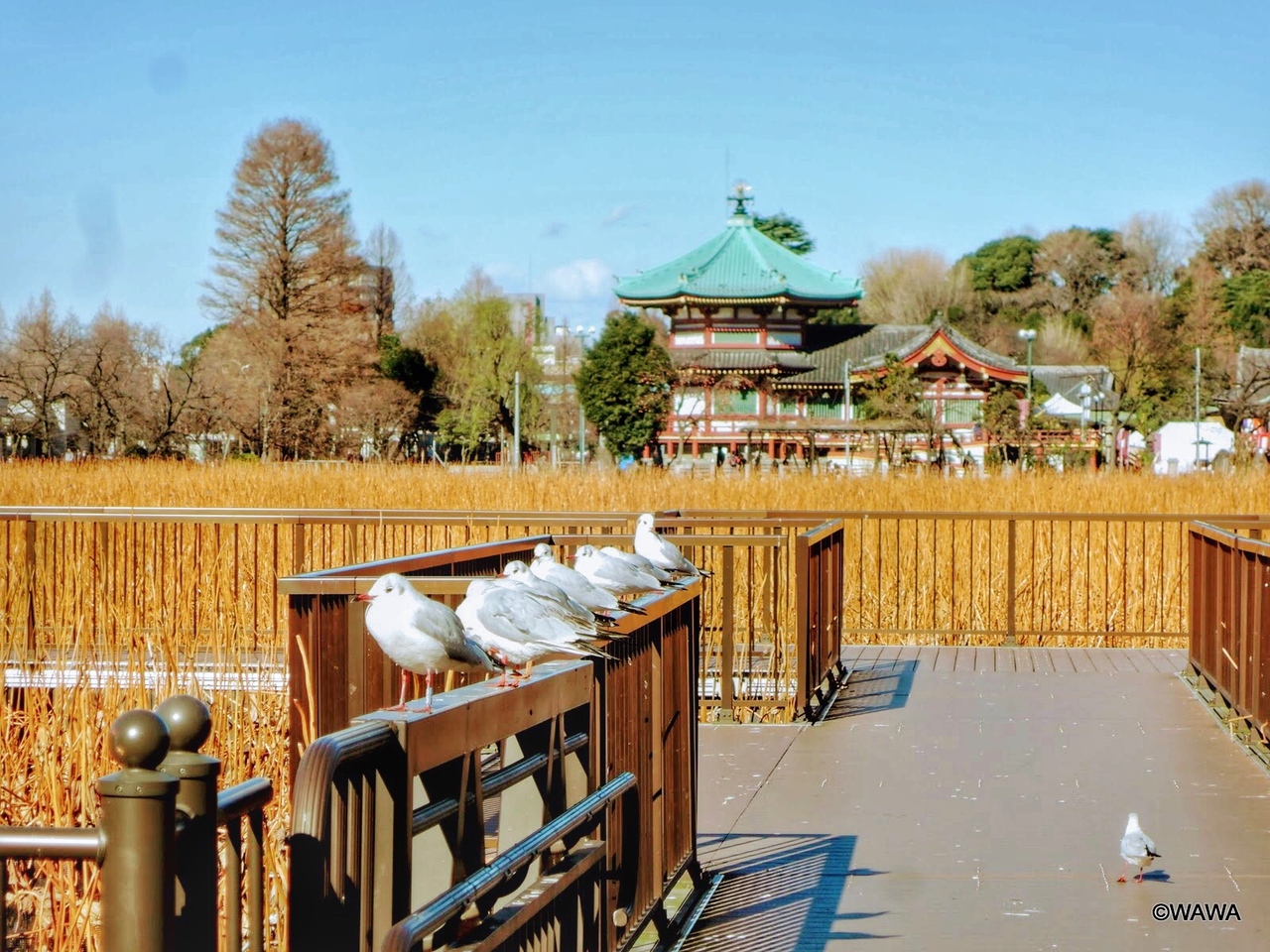 不忍池は上野恩賜公園の南西部にある広い池です。弁天堂やボート小屋が池中央部にあり、参拝客やボート遊びの人も多い観光地です。年末の訪問時には、池一面を覆い尽くすハスの枯れ茎や、カモメを中心とした様々な鳥が羽根を休める蓮池独特の風情が楽しめました。