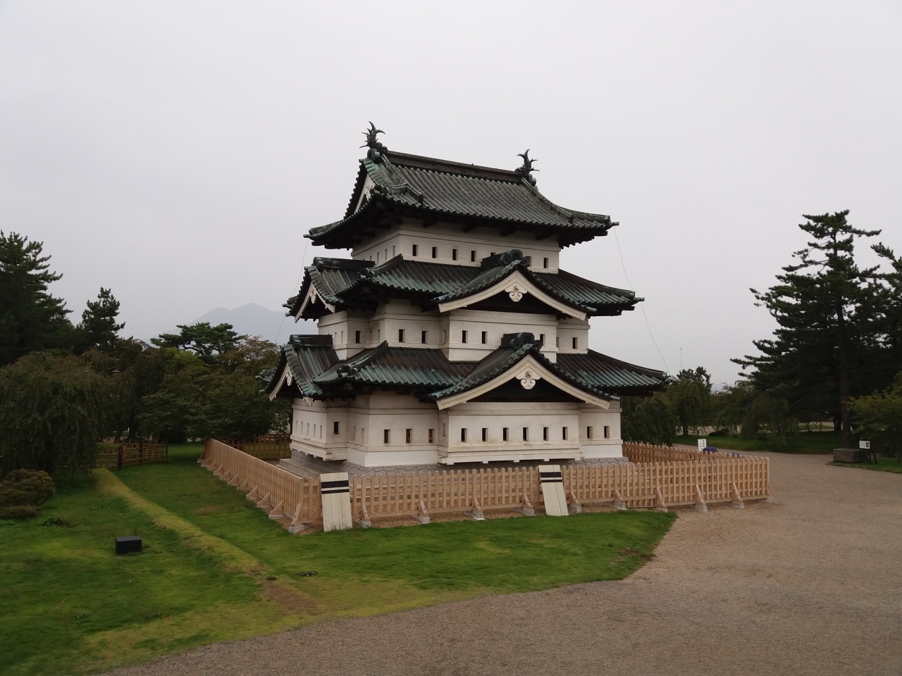 弘前城天守阁本应该在城墙之上,我来到弘前城时天守阁却改变了位置,实际上这是正在对城墙进行修理,据说在东日本大地震之后就已经开始对弘前城城墙的情况进行检查,这城墙本来也属于年久失修,加之大地震的影响,为了修复城墙进行了天守平移工程,通过人类的聪明才智与严谨的执行能力将城墙上的天守阁毫发无损的取下移动到城内的草坪上,真是一件了不起的工程。弘前城所处的津轻地区战国时代曾由南部氏占据,但后来因手下大浦为信叛变而独立。大浦为信是个很会站队的人,在南部氏与当权者丰臣秀吉作对时帮助秀吉与南部氏作战,后来被秀吉授以控制津轻地区的合法权益,于是把名字里的“大浦”改为“津轻”,东北名将“津轻为信”诞生。秀吉死后的关原合战时为信又加入了川家康的东军,战后被川加封至4万7千石成立了弘前藩,于是开始筑造新城,但此城为信至死也未能竣工,因为为信去世筑城工程一时停滞,后来在为信之子信枚的领导下恢复工事,弘前城这才建成。在竣工十多年后,弘前城遭遇雷击失去了天守阁,直到1810年才修筑好新的天守。幕末戊辰战争时弘前藩最初加入奥羽越列藩同盟,后来在秋田藩的影响下叛变,曾与同盟军的南部氏盛冈藩激战,津轻氏与南部氏在战国时代结了快300年的梁子憋到此刻终于找到机会爆发,不过盛冈藩终究还是没能夺下弘前,而弘前藩改投的新政府军利用新式武器和西洋部队编制在战争中占尽优势成为胜者,战争结束后弘前城天守阁未受伤害。即便是二战也没有摧毁弘前城天守阁,于是这座天守阁留存至今,成为日本东北地区唯一一座现存天守,也是目前日本地理位置最北的现存天守。除了天守阁,弘前城的北门也是现存古建,有这两处古建就已经很了不起,弘前城还复原了好几处橹和城门,占地面积又大,是一片非常棒的古城公园。