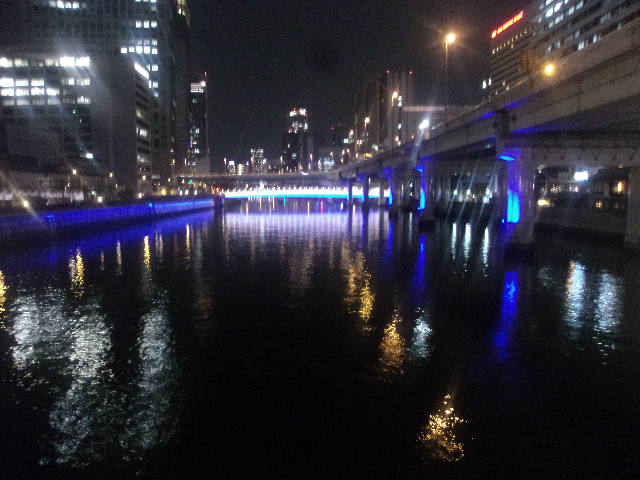 夜の大江橋、近未来的な雰囲気が漂っていました