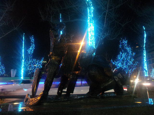 大阪を代表する大通り、御堂筋の歩道沿いには沢山の彫刻作品が並んでいて、昼間はじっくりとその芸術的風情を楽しみながら歩くと良いですが、夜間は影のあるアングルで撮影出来たりして、ある意味ちょっとオカルト的なテイストでも楽しめます。今回私は丁度御堂筋イルミネーションの開催時に彫刻鑑賞を楽しみましたが、同じ夜景バックでも、LED系の青色が主体のイルミネーションバックだと、少し温かみのある風情で撮影出来て、被写体としてはお勧めできます。ただ、やはり高性能のカメラがないと、写真の出来栄えとしてはイマイチなので、光景を目に焼き付けながら、一期一会の感覚で現場を楽しまれると良いかなと思います。
