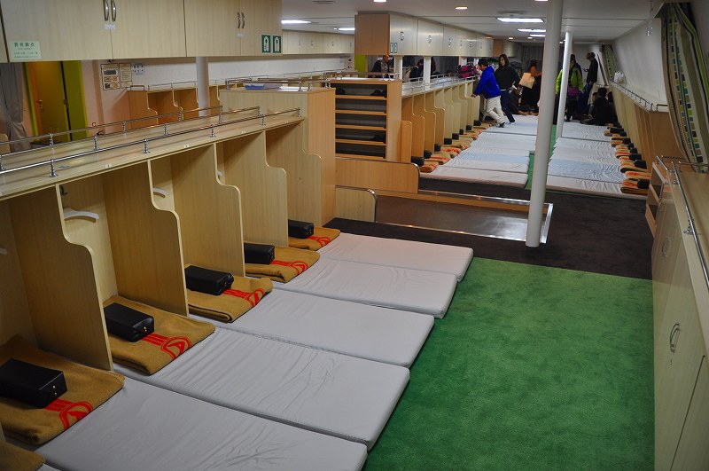 鹿児島と奄美大島の往復で利用した。片道約11時間だが、行きも帰りも定時運航だった。船室はいくつか等級があり、最も安い2等に乗った。片道9050円だが、さらに安い「交流割引」7050円というのがあった。和室の大部屋。一人ずつの寝床スペースはかなり狭い。壁際か窓際を指定すると片側は人がいないので両側を人に挟まれて寝るという事態は避けられる。鹿児島発は切符購入時に指定できる。奄美大島発は、乗船時に乗船口に立つスタッフが指定のシールをくれるので、このとき希望を言うと応じてくれる。すいているときは、指定を離れて空いているところで眠ることもできる。