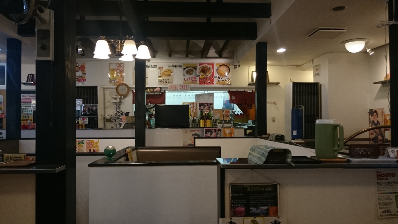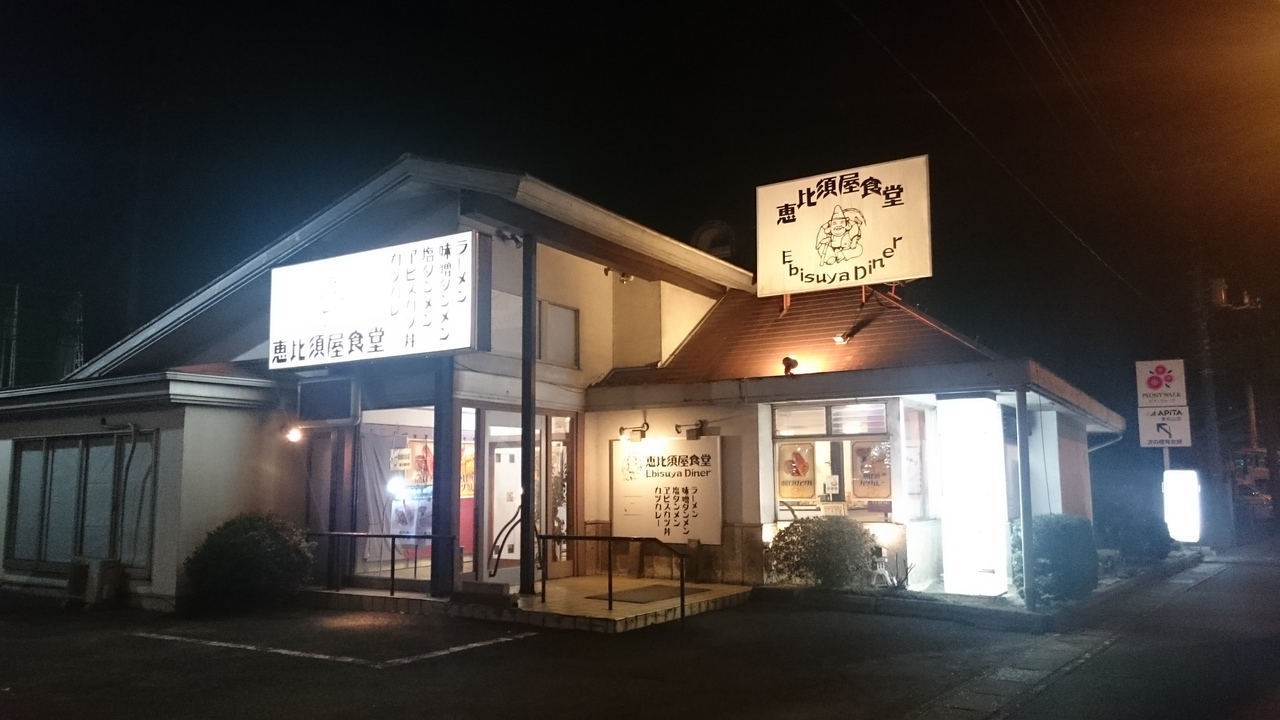 関越道東松山ICからすぐのところにある食堂。白いきれいなお店。名前のとおり、エビスビールのキャラクターの戎さんがお店のキャラクターのようです。ちなみにお店の中のビールは当然、エビスビール。「恵比須カツ丼」と「恵比須カツカレー」が名物ですが、他の料理も美味しそうで迷ってしまいそう。今回はイチオシの「恵比須カツカレー」を注文。四元豚を使ったカツが、カツ丼もカツカレーも2枚のっています。カツ2枚で240グラムもあるので、ご飯を大盛りにするか迷いましたが、普通盛りで300グラムあるとのことなので普通盛り。足りなかったら小ライスを追加すればいいですよ、と店主さんのアドバイスあり。カツは注文があってから揚げるとのこと。サクサクで、柔らかいカツは美味。ソースでも食べられるように取り分けのお皿がついてきます。カレーは煮込まれているタイプで、カツとの相性は抜群です。店員さんの感じも良く、また行きたいなぁと思うお店。閉店時間は23時45分なので、かなり遅くまでやっています。