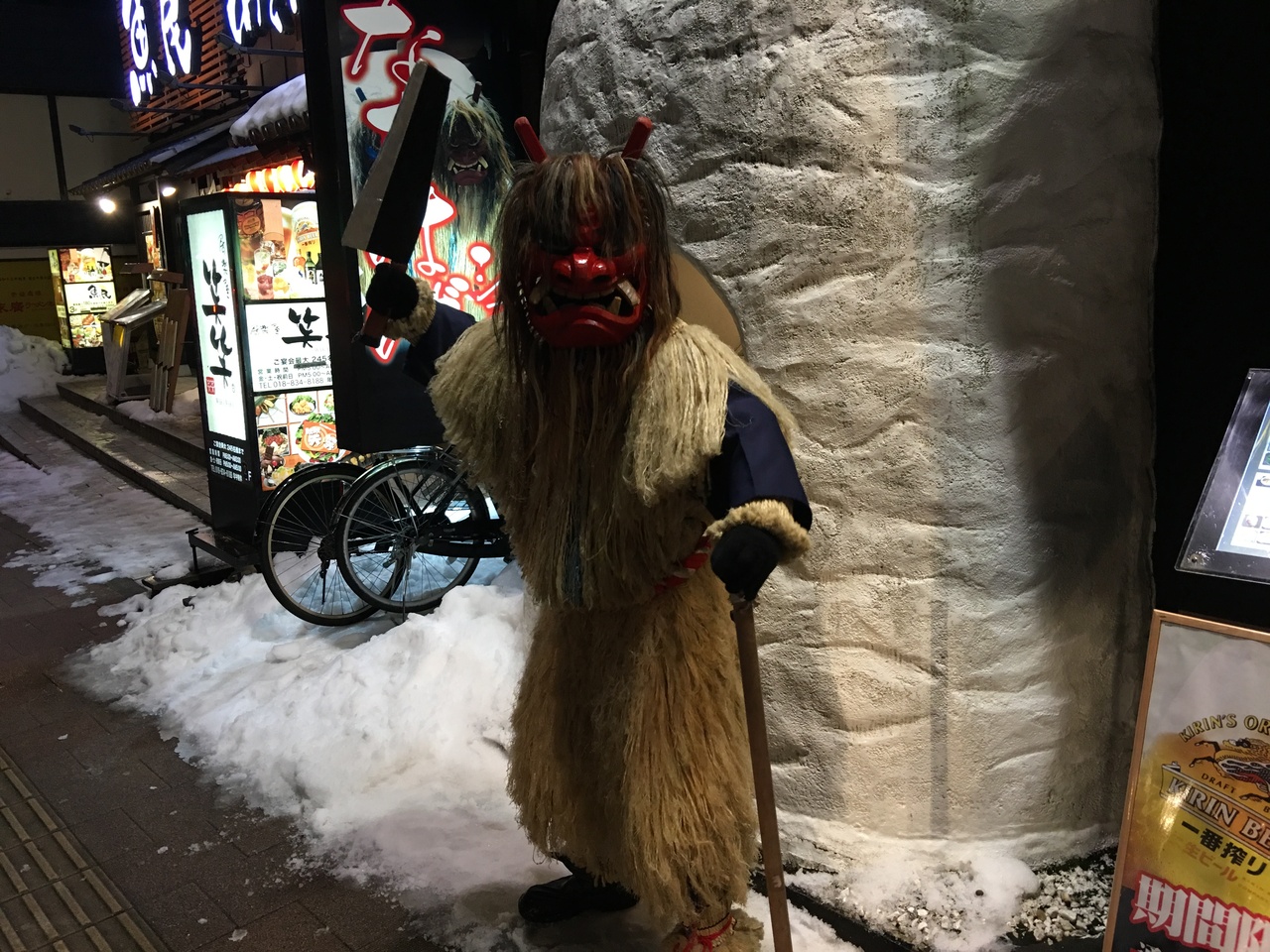店を出ると、店の前にはなまはげがいました。写真撮らせてと頼むと「ウッー!」と快いご返事をいただけました。