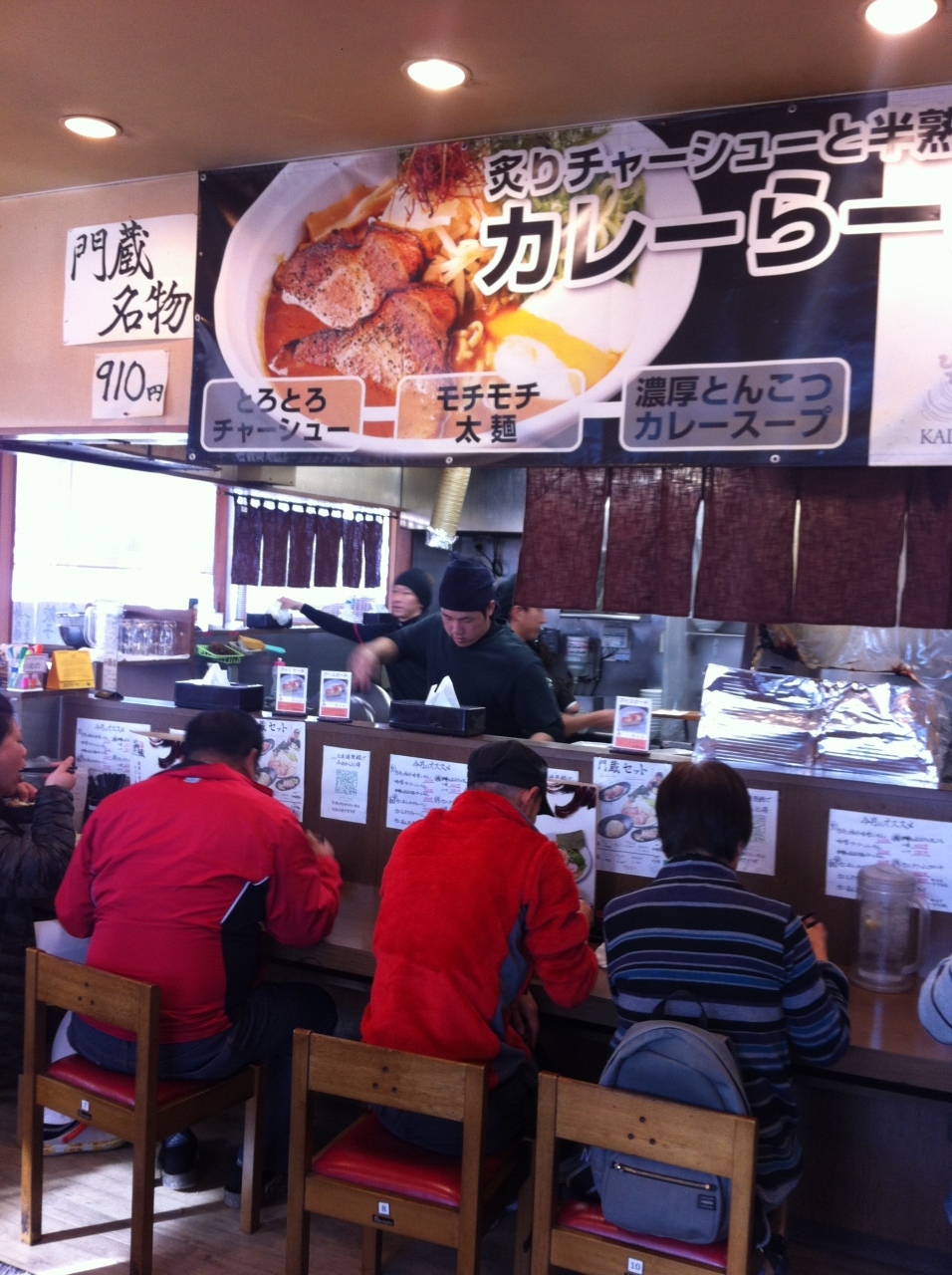 ちゃちゃっと食べたくて入ったらーめん門蔵さんですが、店内満員で大盛況。カウンター席上にデカデカとカレーラーメンが宣伝されており、やっぱそいつ食べるしかないといただきました。もちもち麺に熱々カレーで猫舌にはちょっとキツイ、濃厚とんこつカレーということで味も濃いですが、半熟卵をかきまぜて まろやかにしてたべるのもよい。