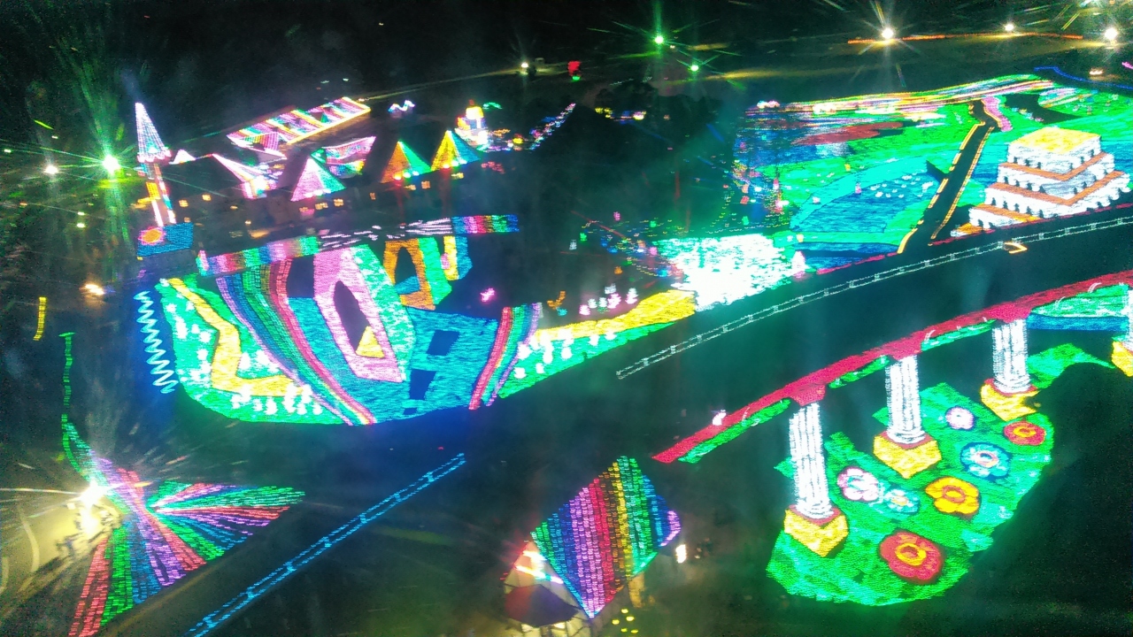 ツアーで訪問しました。17時点灯ですので、辺りはまだ少し明るく、周りが良く見えました。観覧車は500円で、1周9分。20分程待ちましたが、上から全容が見渡せます。イルミネーションが毎年変わるので、毎年行っています。お勧めです。