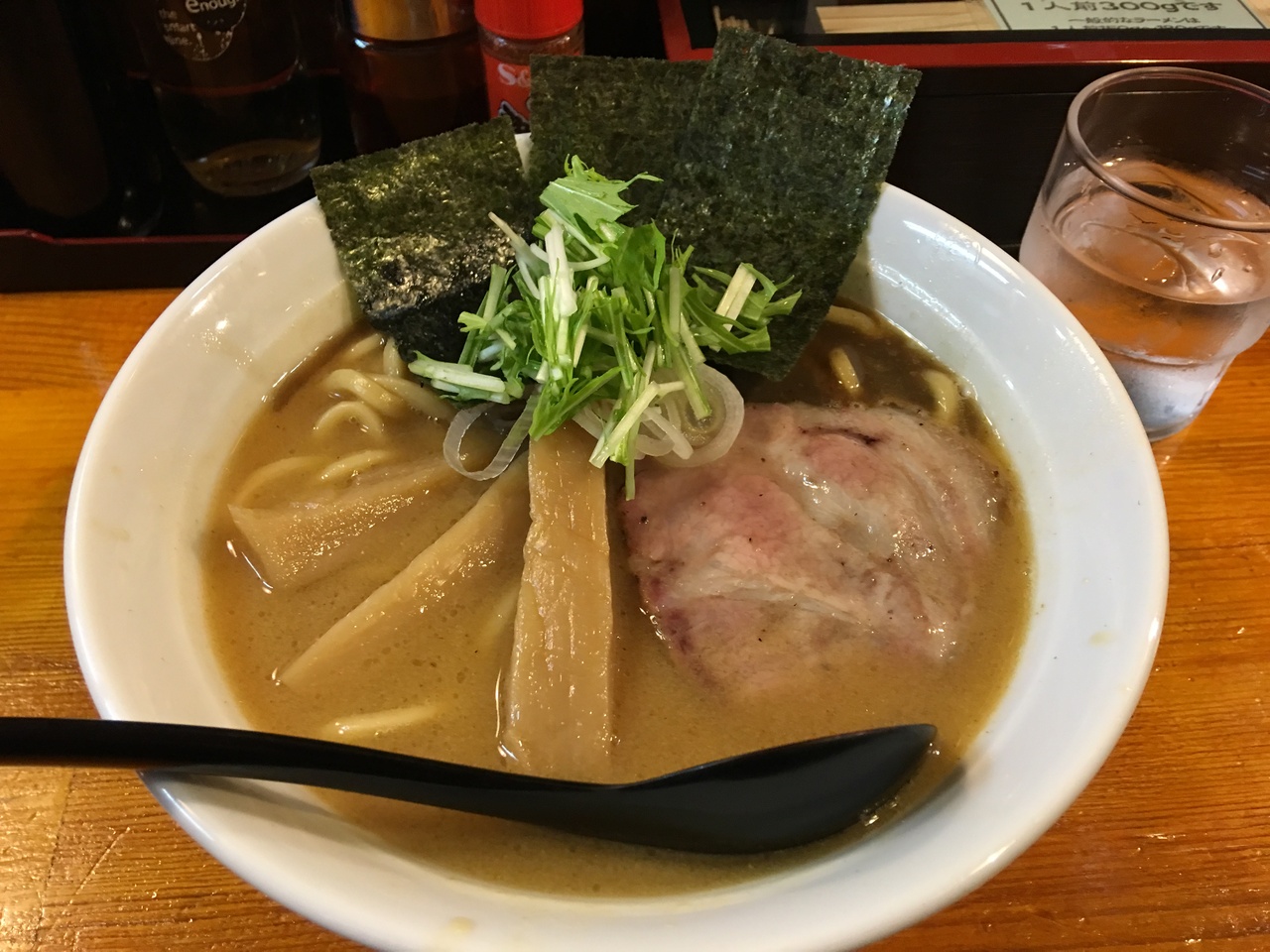 魚介系のスープで極太麺を使用したラーメンのお店で、店の目の前には行列ができていました。300グラムの極太麺ではお腹いっぱいになるので、 50円引きの800円の小ラーメンをいただきましたが、十分なボリュームでした。臭みのないスープで美味しかったです。