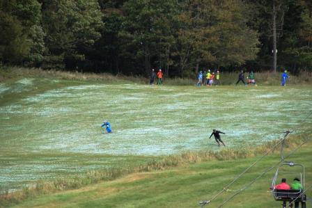 10月初旬、日光白根山ロープウェーに乗ろうと立ち寄ったのですが、ロープウェー駅手前にあるゲレンデは人工芝が敷き詰められていて、夏スキーを楽しむ大勢のスキーヤーで賑わっていました。全体のコースの最下段ですのでさほどの傾斜には見えませんが、斜面の奥で見えなくなるポイントまで人工芝はつながっていますので、滑走距離は十分ありそうです。見える範囲では中段あたりが最も急らしく、ほとんどのスキーヤーがそこに固まっていました。紅葉をバックにすべるスキーヤーの写真なんてなかなか撮れませんよね。流し撮りできれば尚良し。そういう意味でここは面白い撮影スポットでした。