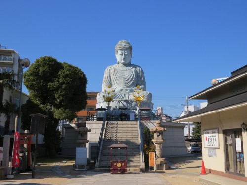 レンタカーを借りるまでの空き時間にぶらぶら歩いていると「兵庫大仏」と書かれた案内板を発見。せっかくなので見学してきました。「日本三大大仏の一つ」と説明板に書かれていましたが、奈良の東大寺、鎌倉の高徳院、高岡の大佛寺の3つを指すものだと思っていたので、実際のところはどうなんだろうか気になりました。台座には階段があり、大仏の目の前まで近づくことができました。