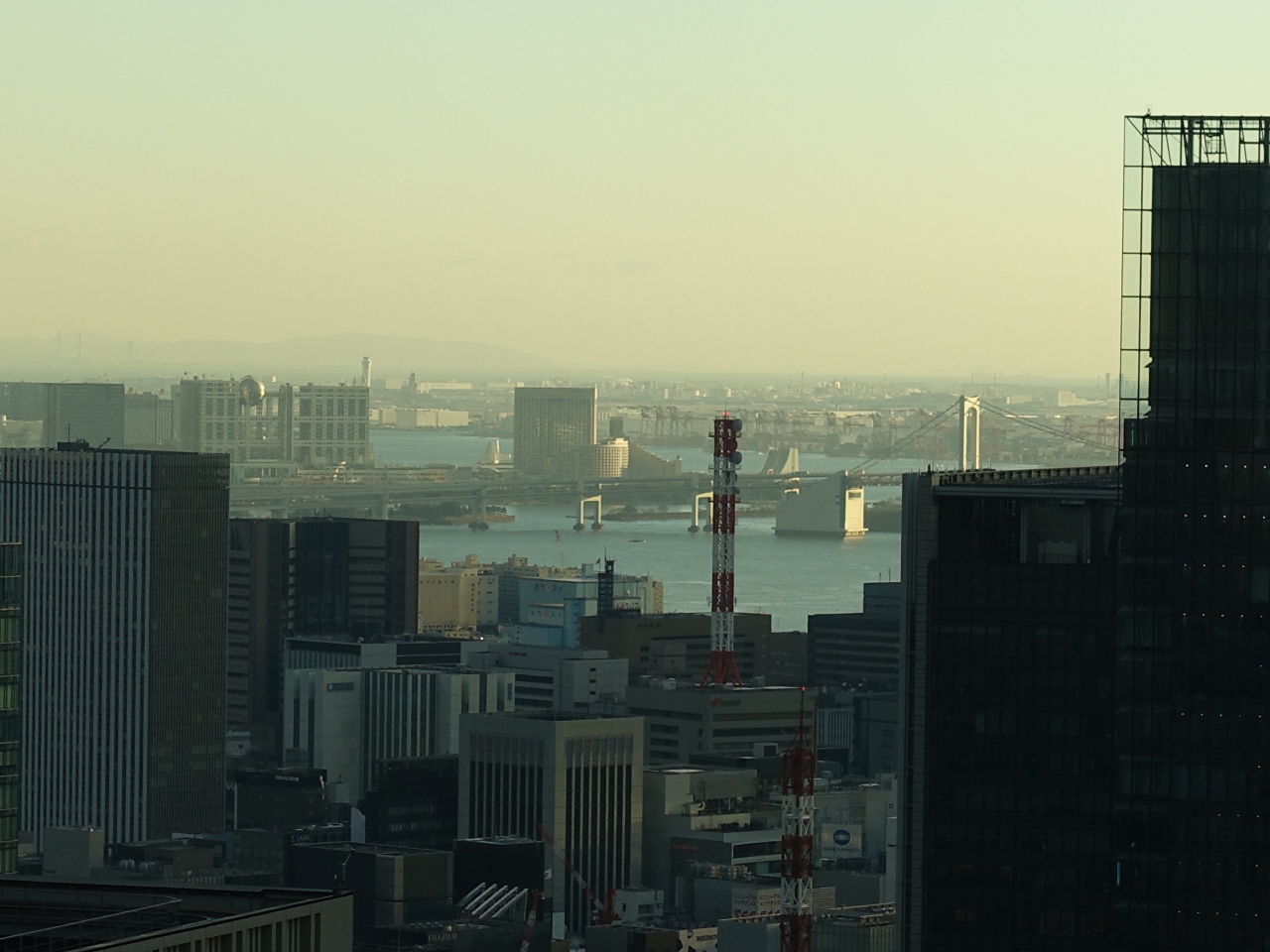 宿泊した丸の内の高層ホテルの客室から、東京駅越しにレインボーブリッジの姿を見る事が出来ました。ビルの間からチラリと見えるレインボーブリッジの姿は、かすかに夕陽に染まり、とてもロマンティックでした。空気の澄む1月ならではの光景だと思います。その先にはお台場の建築群が見え、東京駅との直線距離が近い事が実感されました。大都会・東京も、建物や人の密度は高くとも、それほど広くはないのだと改めて感じる、いつまでも見ていたくなるような光景でした。