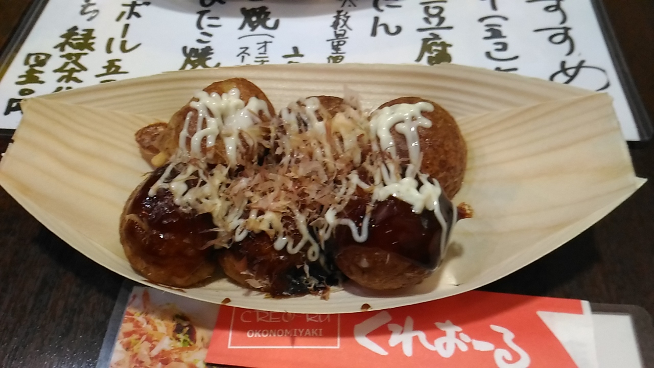 JR京橋駅北口から徒歩3分くらいに「くれおーる」の看板があります。店先の串かつ、鉄板焼、たこ焼のセットメニューにつられて、ちょい飲み入店。生ビールでたこ焼セットを注文、1080円也。結構お持ち帰りで、たこ焼きが人気のようでした。確かにアツアツで美味しかったですね。