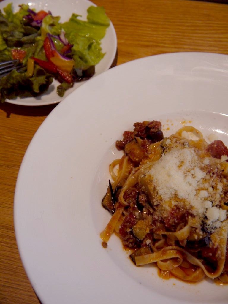 パスタは、ソースが3種類から選べ、またパスタも数種類から選べる。今回、ソースはナスと挽肉のボロネーゼ、パスタはタリアテッレを選んだ。ソースは、その名の通り、大降りにカットされたナスと、挽肉がたっぷりのトマトソースで、トマトの酸味と、ジューシーなナス、そして挽肉のバランスが良い。タリアテッレは、リボン状のパスタで、存在感があり、「パスタを食べている」という気分にさせてくれた。