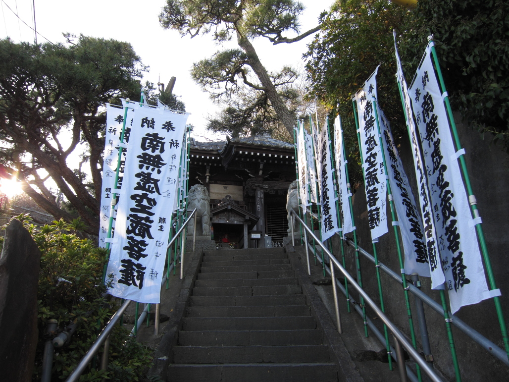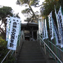 鎌倉十井の一つ・星の井(星月の井)のところから、白旗が立つ参道(階段)が続いており、階段を登ったところに本殿があります。