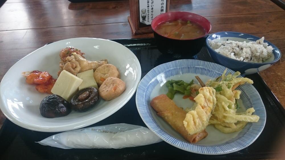 肉ジャガ 山菜の天ぷら、魚の南蛮漬け、山くらげ、ポテトサラダ、ぷりっぷりの椎茸の煮物、がんも、高野豆腐、春巻き、鶏のさっぱり煮、エビチリなどなど。 他に具だくさんの田舎味噌汁、特製カレー、蒸しパン、団子、梨、コーヒー。