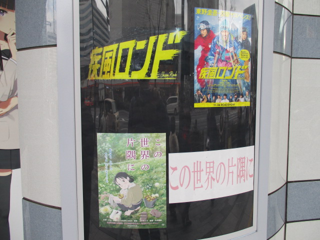 JR有楽町駅から首都高速の高架を超えた銀座の外堀通り沿いにある丸の内TOEI映画館です。丸の内TOEIは昭和のレトロな雰囲気を色濃く残す映画館でスクリーンは2個のみということで昔のシンプルスタイルです。この世界の片隅を上映してたので覗いて見ました。客席は500ぐらいでのんびり落ち着いて見れます。
