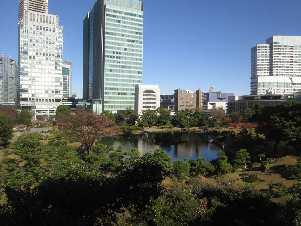 浜松町駅を下車してすぐのところにあります。都会のなかに突然現れる庭園です。ある程度人工的に造られた庭園でしょうが、名石が用いられた庭造りが行われており、自然の雰囲気を感じます。木と芝生の緑、数々の石、そして池がいくつかあり美しかったです。