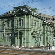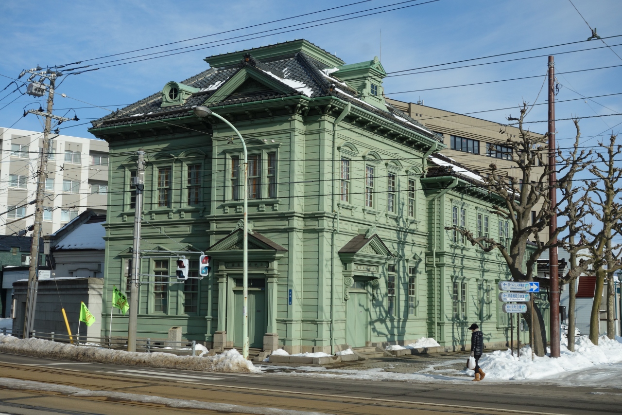 旧函館公会堂の方面から基坂を下りてきたところにある大きな近代建築です。ペパーミントグリーン色が印象的な建築ですが、残念なことに電線が煩い。函館は雪国であるし観光地でもあるのだから、電線はすべて地下に埋設すればいいと思うのですが。それだけで随分と景観が良くなると思います。