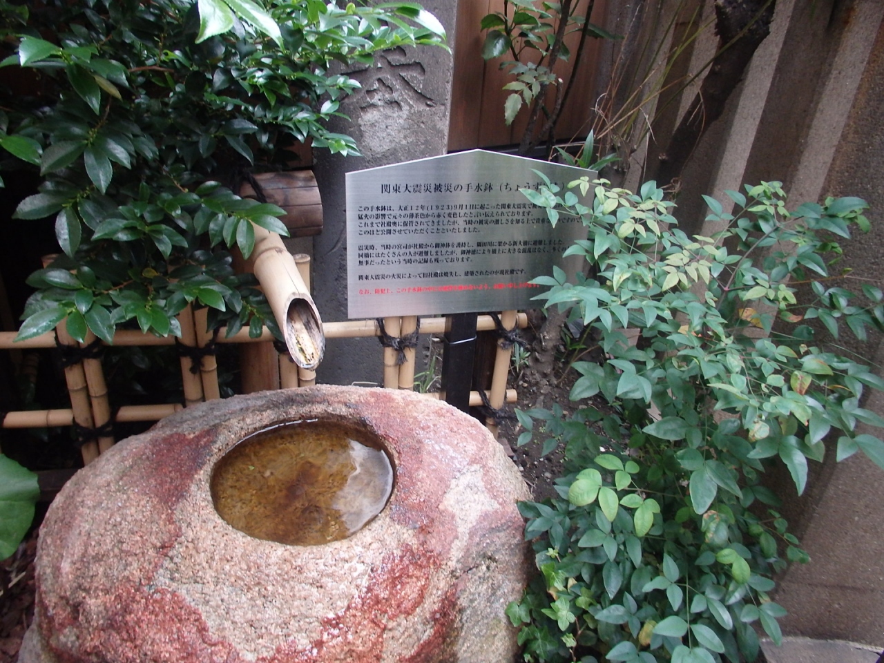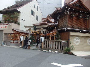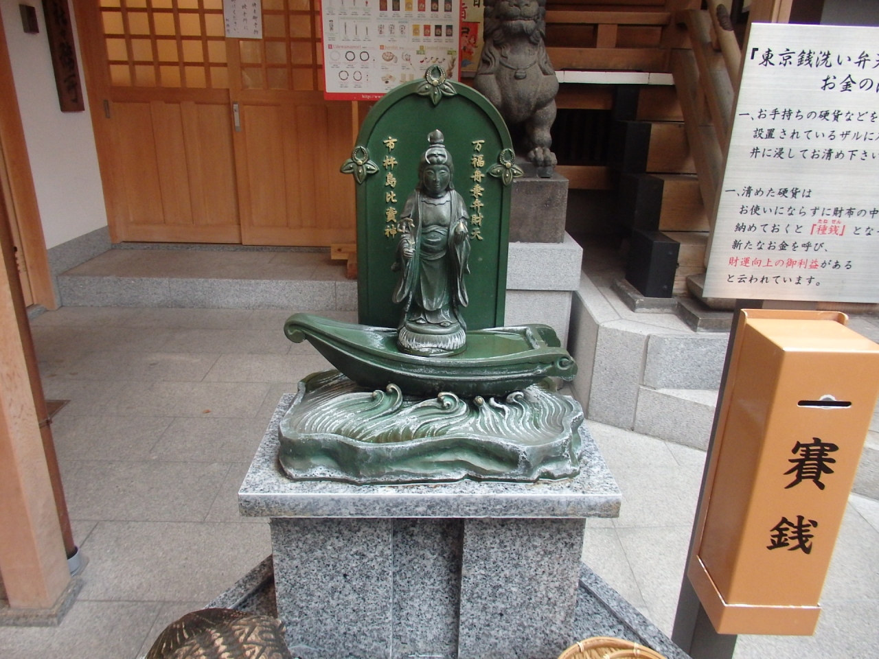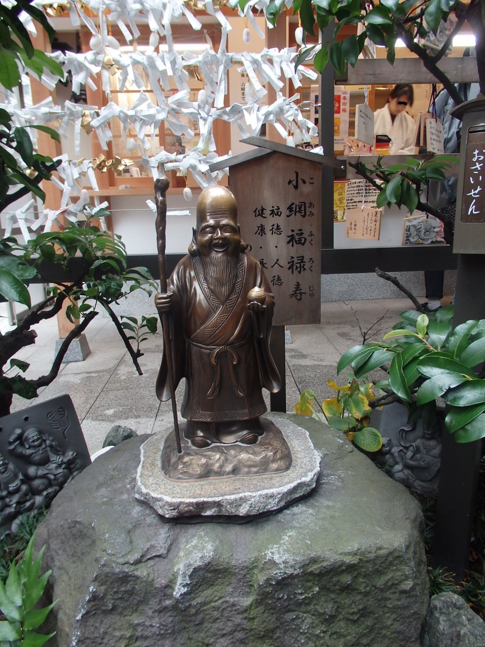 福禄寿は中国出身の神様で、招福と立身出世の神様です。ここもビルの谷間にある小さな神社です。社殿、神楽殿は昭和の造営。向拝には登り龍、下り龍、獅子等の彫刻が施されています。石座の上に福禄寿があり、本日初めて七福神を見ました。また銭洗い弁天がありましたが、鎌倉の弁財天と異なり洗い場1箇所、正月は混むでしょうね。また境内には関東大震災の激しさを示すために、火事で焼け残った赤茶けた手水鉢が置いてありました。本日廻った6社よりは寺社らしさが見られました