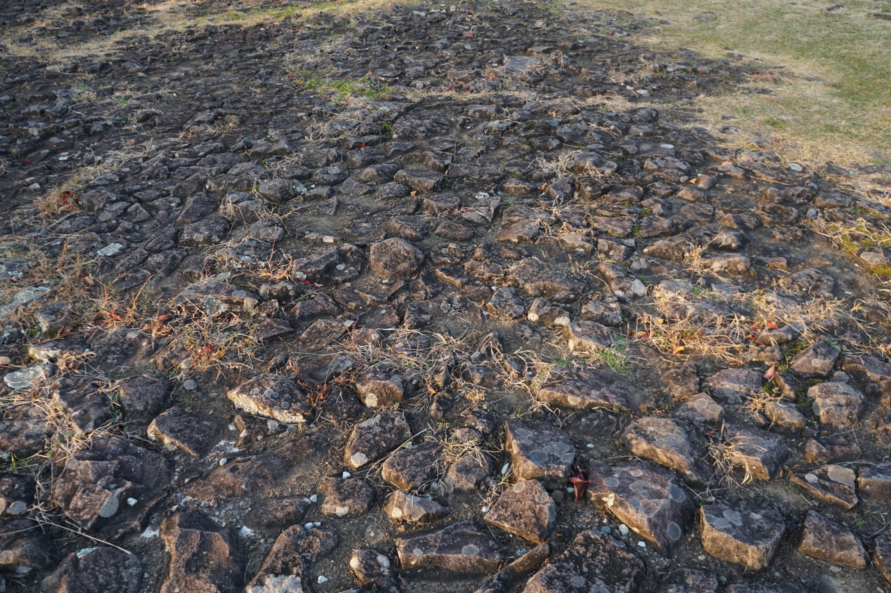 広場はごろた石で敷き詰められていて、ちょっと歩きにくいのですが、たぶん石は広場の基礎を固めたもの。当時は石は表面には出ていなかったんだろうと思います。しかし、こうしたところにも十分に手を掛けて造作されていることは素晴らしい。けっこう感心した次第です。