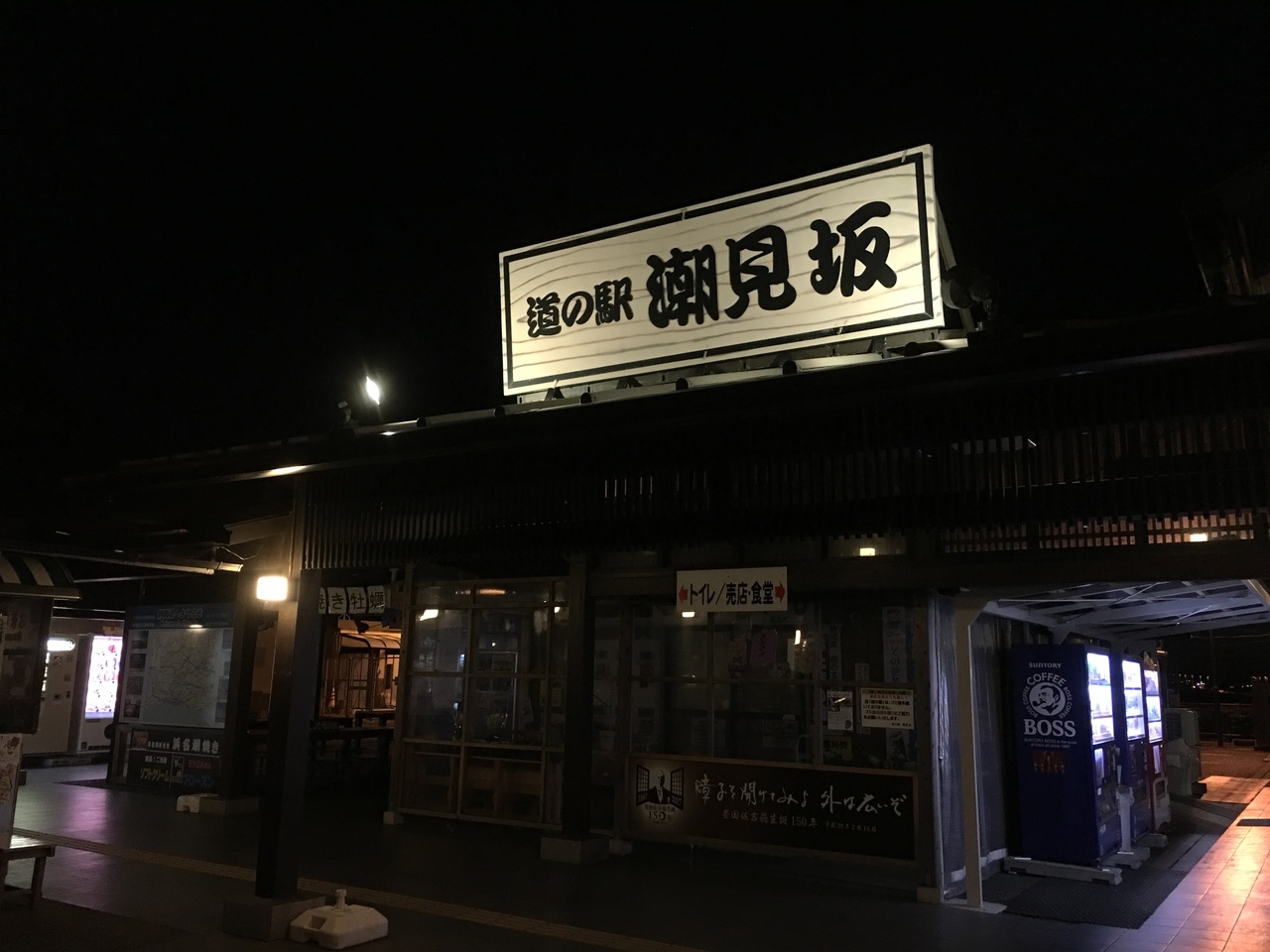 道の駅潮見坂は夜中に入りました。パーキングでは乗用車が仮眠中なのか沢山停まってました。駐車場はトラック、乗用車と別れていてとても広いです。売店は夜中なので閉まっていましたが、焼き牡蠣を売りにしたお店があり是非食べてみたいです。ここからは歩いて海に出れるみたいで案内標識が有りました。残念な事にトイレは古い感じです。