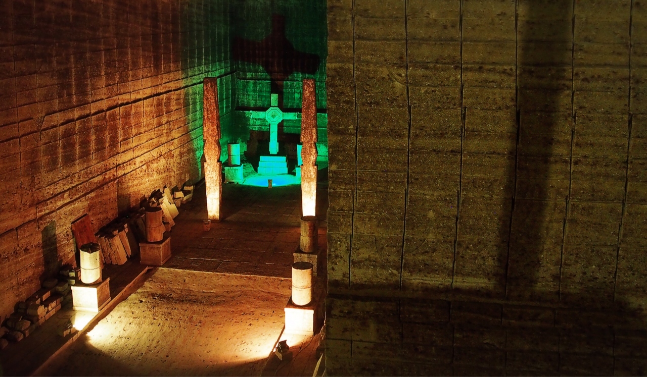 この一帯はかつて大谷石の採掘場として栄えていたそうで、採石場の跡地が資料館になっています。中に入ってみると巨大な地下空間にびっくり。中は冷んやりとして寒いです。外は20度以上あったのに、中の気温は8度。内部はまるで地下宮殿のようで、ライトアップされ幻想的な雰囲気を醸し出しています。なかなかこういう場所はないので、ここで映画やPVの撮影が行われるのも頷けます。