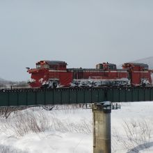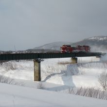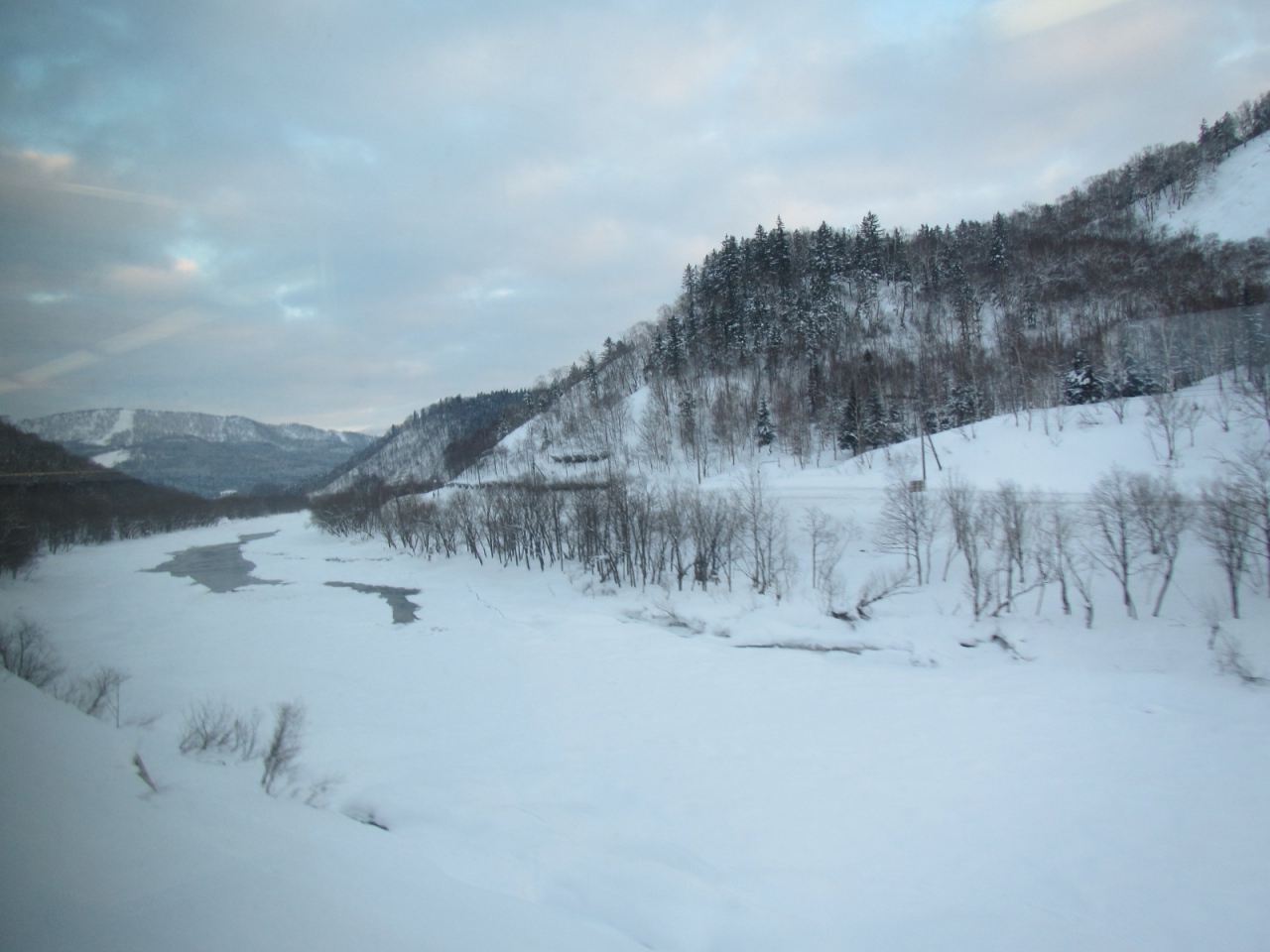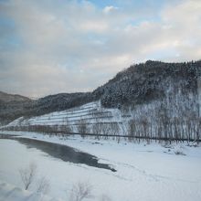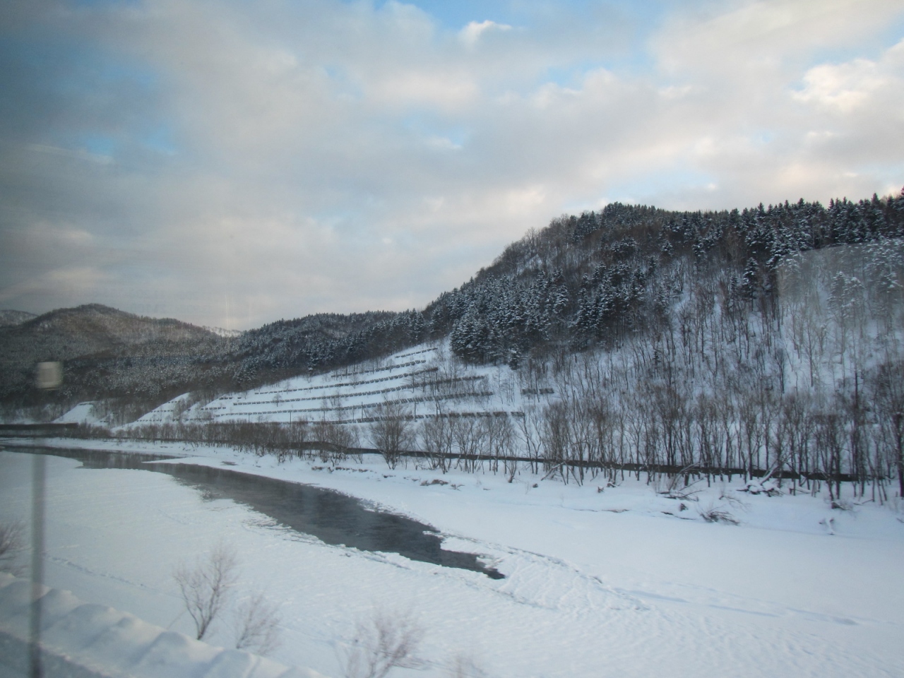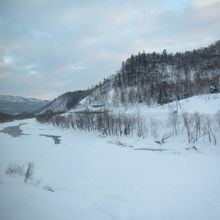 車窓から、日本で4番目の長さを誇る大河、天塩川が結氷する様子が見られます。