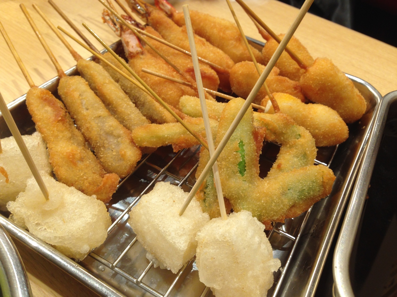 せっかくなので本店に行こうと思い数日前に電話したらすでに予約でいっぱい。本店からすぐ近くにあるこちらの法善寺店に確認したところ空きがあったので予約をお願いしました。予約の場合はコースの注文が必要とのこと、あと90分制でした。店に着いてとりあえずドリンクを注文。コースは道頓堀セット1400円にしました。好き嫌いがなく、ある程度人数がいる場合はコースの方が楽です。コースに含まれているもつ煮込み(他に枝豆、キムチもあります)を食べながら待つこと10分ほど、第一弾として5種類の串カツが運ばれてきました。きめの細かい衣に包まれた揚げたてサクサクの串カツ。ビールがすすみます。頃合いを見計らって第二弾(4種類)が運ばれてきます。お気に入りは餅とアスパラ。予算は一人2000ー3000円くらいと気軽に立ち寄れるのもいいです。