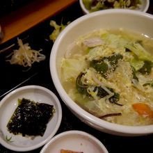 ご飯に温野菜や豚肉をトッピングし、塩ベースのスープをかけたもの。韓国風の茶漬けとも言える。